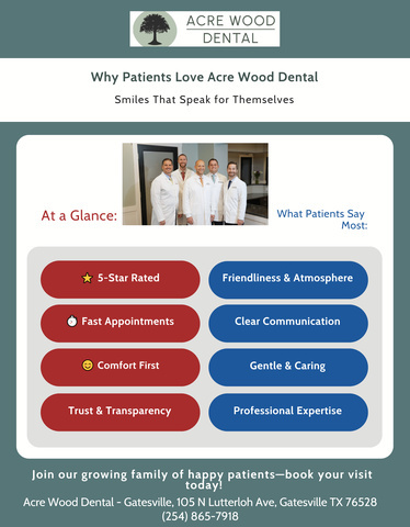 People here often say they want a space that feels calm, not clinical. A warm greeting at the front desk, a team that remembers their names, and an atmosphere that doesn’t heighten the nerves already associated with dental visits — these details quietly shape a patient’s entire experience. It’s why practices like Acre Wood Dental — Gatesville frequently stand out in local conversations. Patients mention not just the care they received, but the people who made them feel at ease.