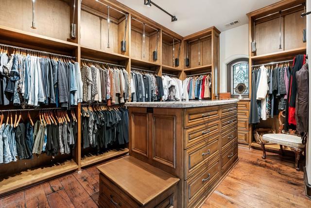 Closets feature wood flooring, abundant hanging and storage.