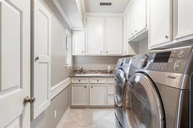 Washer and dryer convey in this well thought utility room with sink and generous storage space.