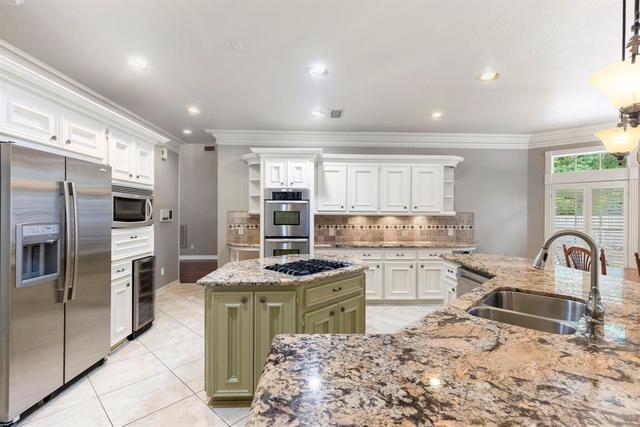 Kitchen also features under cabinet lighting, wine chiller, double ovens and island gas cooktop.