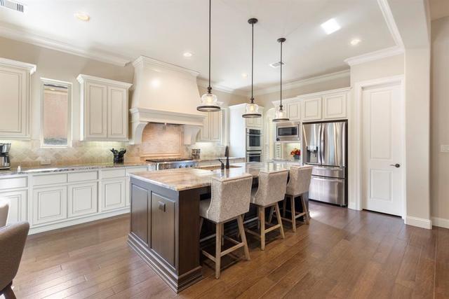 Stunning Darling patio home located on a private cul-de-sac next to a greenbelt in the heart of Woodforest, TX. The European-inspired design features lush, exquisitely landscaped grounds, a gated front courtyard, and a striking turret entry. Inside, the light-filled open floor plan boasts rich hardwood floors, exposed wood beams, and a stunning family room with a corner stacked stone fireplace. The gourmet kitchen showcases a single-slab granite island, a 6-burner gas cooktop, double ovens, custom slide-out drawers, and a walk-in pantry. The private primary suite features tray ceilings, a luxurious en suite bath, and custom closets with direct utility room access. A casita with its own entrance and en suite bath ensures ultimate comfort for your guests. Exceptional outdoor living spaces include a covered back patio with a summer kitchen, a pergola and a stone fire pit. 2024 upgrades include a whole house Generac generator and surge protector, new AC and a new LG refrigerator.
