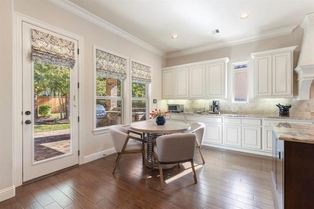 Stunning Darling patio home located on a private cul-de-sac next to a greenbelt in the heart of Woodforest, TX. The European-inspired design features lush, exquisitely landscaped grounds, a gated front courtyard, and a striking turret entry. Inside, the light-filled open floor plan boasts rich hardwood floors, exposed wood beams, and a stunning family room with a corner stacked stone fireplace. The gourmet kitchen showcases a single-slab granite island, a 6-burner gas cooktop, double ovens, custom slide-out drawers, and a walk-in pantry. The private primary suite features tray ceilings, a luxurious en suite bath, and custom closets with direct utility room access. A casita with its own entrance and en suite bath ensures ultimate comfort for your guests. Exceptional outdoor living spaces include a covered back patio with a summer kitchen, a pergola and a stone fire pit. 2024 upgrades include a whole house Generac generator and surge protector, new AC and a new LG refrigerator.