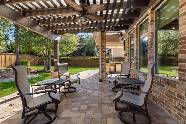 Stunning Darling patio home located on a private cul-de-sac next to a greenbelt in the heart of Woodforest, TX. The European-inspired design features lush, exquisitely landscaped grounds, a gated front courtyard, and a striking turret entry. Inside, the light-filled open floor plan boasts rich hardwood floors, exposed wood beams, and a stunning family room with a corner stacked stone fireplace. The gourmet kitchen showcases a single-slab granite island, a 6-burner gas cooktop, double ovens, custom slide-out drawers, and a walk-in pantry. The private primary suite features tray ceilings, a luxurious en suite bath, and custom closets with direct utility room access. A casita with its own entrance and en suite bath ensures ultimate comfort for your guests. Exceptional outdoor living spaces include a covered back patio with a summer kitchen, a pergola and a stone fire pit. 2024 upgrades include a whole house Generac generator and surge protector, new AC and a new LG refrigerator.