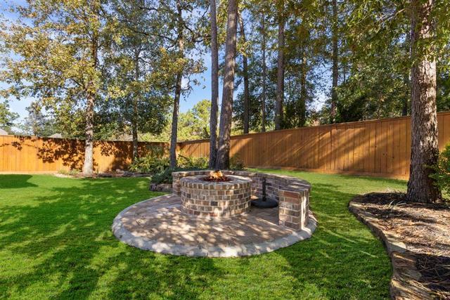 Stunning Darling patio home located on a private cul-de-sac next to a greenbelt in the heart of Woodforest, TX. The European-inspired design features lush, exquisitely landscaped grounds, a gated front courtyard, and a striking turret entry. Inside, the light-filled open floor plan boasts rich hardwood floors, exposed wood beams, and a stunning family room with a corner stacked stone fireplace. The gourmet kitchen showcases a single-slab granite island, a 6-burner gas cooktop, double ovens, custom slide-out drawers, and a walk-in pantry. The private primary suite features tray ceilings, a luxurious en suite bath, and custom closets with direct utility room access. A casita with its own entrance and en suite bath ensures ultimate comfort for your guests. Exceptional outdoor living spaces include a covered back patio with a summer kitchen, a pergola and a stone fire pit. 2024 upgrades include a whole house Generac generator and surge protector, new AC and a new LG refrigerator.