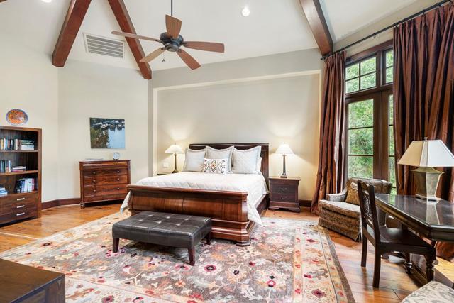 Hand-scraped wood floors, wood beams and exceptional views compliment the primary suite.
